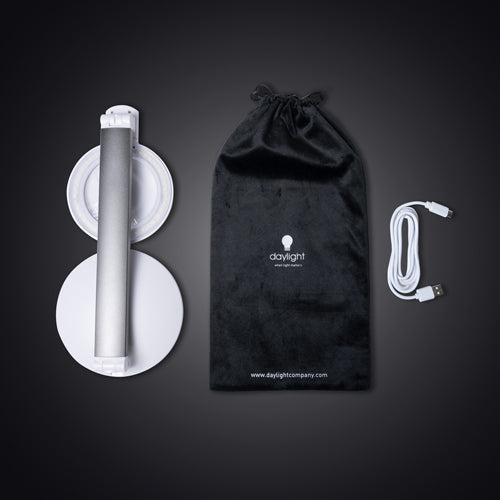 Portable desktop magnifying lamp with USB for on-the-go re-charging. Lamp folds flat for transportation. Ideal for visiting artists, home visit beauticians and as a space-saving reading light.